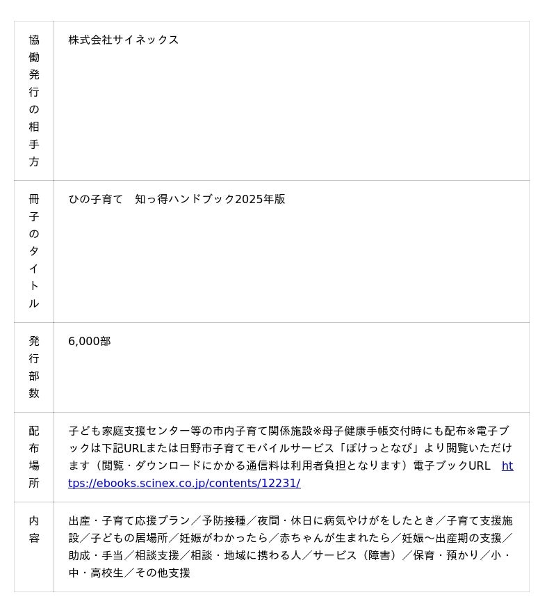 赤ちゃんや子どもたちの健やかな成長を応援するため、日野市の子育てに関するさまざまな情報を1冊にまとめた「ひの子育て 知っ得ハンドブック 2025年版」を株式会社サイネックスとの協働事業として発行しました。