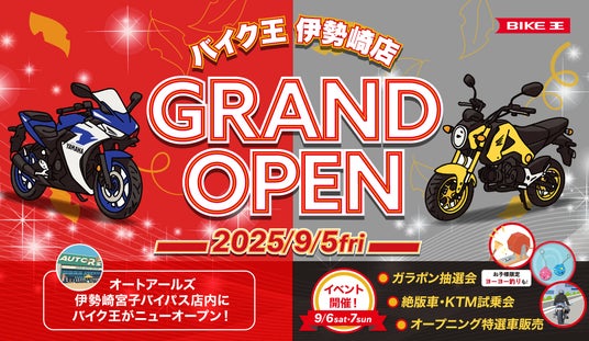 「まだ世界にない、感動をつくる。」をコーポレートミッションに掲げ、ビジョンである「バイクライフの生涯パートナー」の実現に向けて、事業を展開する株式会社バイク王&カンパニー(代表取締役CEO:澤篤史、本社:東京都世田谷区、証券コード:3377、以下「当社」)は、群馬県伊勢崎市に「バイク王 伊勢崎店」(以下、本店舗)を2025年9月5日(金)に新規オープンいたします。