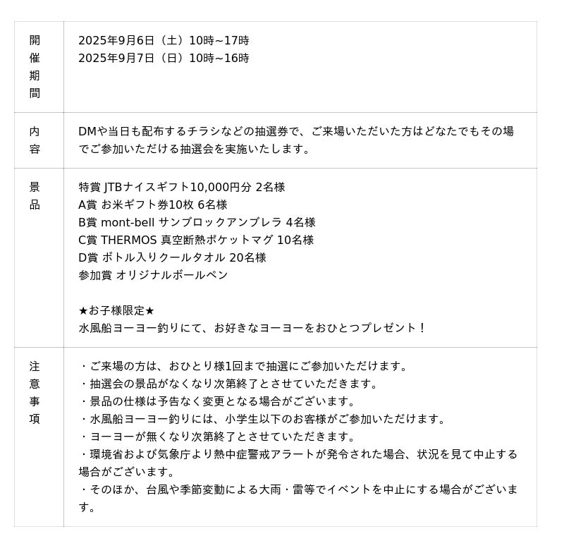 9月6日(土)・9月7日(日)の2日間、ガラポン抽選会を開催いたします。JTBナイスギフト10,000円分、お米ギフト券、mont-bell サンブロックアンブレラなど豪華景品をご用意しております。当日も配布する抽選券で、来場された方ならどなたでもご参加いただけますので、ぜひご参加ください。