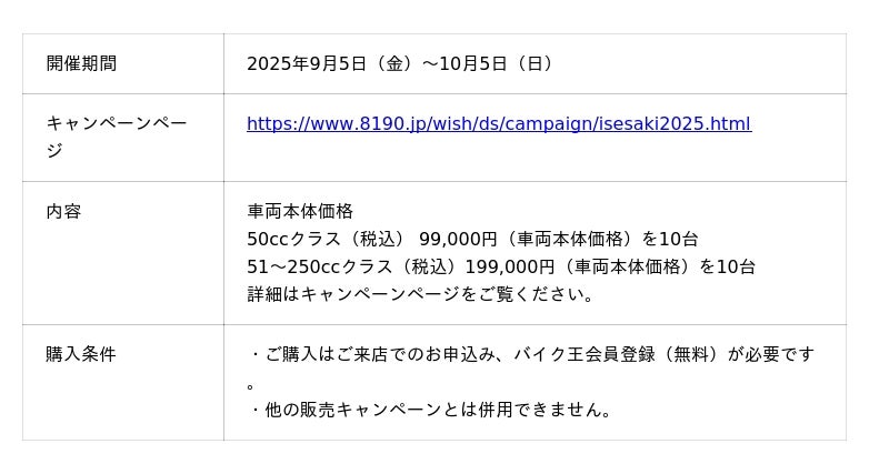 9月5日(金)~10月5日(日)までの期間限定で、50ccクラスは車両本体価格99,000円(税込)、51~250ccクラスは車両本体価格199,000円(税込)の目玉車両をそれぞれ10台ずつ販売いたします。