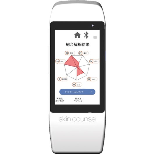 <コスメデコルテ>年代別でわかる肌コンディションハンディ機器「スキンカウンセルV」で油分・水分・毛穴など8項目をチェック。蓄積データと年代別比較で、自分の肌状態が一目でわかります。