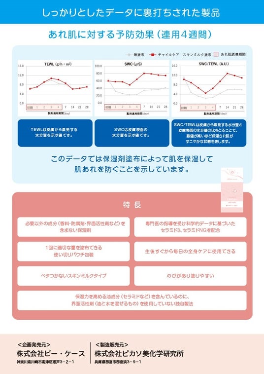 赤ちゃんの皮膚バリアーは非常に弱くデリケートです。保湿剤は長期にわたり使用されることが多く、その赤ちゃんの肌に今回の保湿剤チャイルケアスキンミルクを開発しました。チャイルケアスキンミルクで赤ちゃんの健やかな肌を守りたいと考えています。