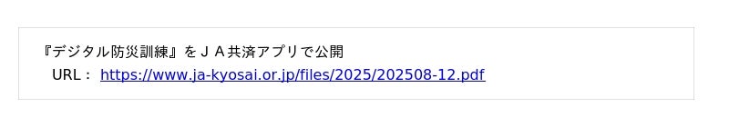 JA共済連(全国共済農業協同組合連合会・代表理事理事長 村山 美彦)は、8月28日(木)に、JA共済アプリ内で公開した「デジタル防災訓練」の発表に合わせて、「JA共済 デジタル防災訓練発表会」を実施いたしました。