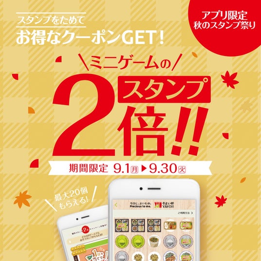 このたび日本国内の「やよい軒」では、やよい軒公式アプリ限定『スタンプ2倍キャンペーン』を実施いたします。9月1日(月)10時から、ミニゲームで貰えるスタンプが2倍になるキャンペーンを実施いたします。