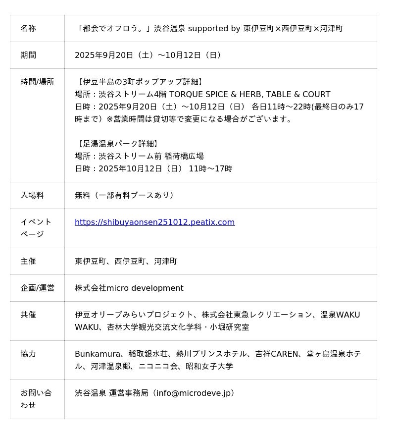 株式会社micro development(本社:静岡県賀茂郡東伊豆町、代表取締役社長:守屋真一)は、9月20日(土)~10月12日(日)に渋谷ストリーム4階「TORQUE SPICE & HERB, TABLE & COURT」にてポップアップのお土産コーナーやカフェコラボメニューを開催。最終日の10月12日(日)には渋谷ストリーム前「稲荷橋広場」にて、東伊豆町・西伊豆町・河津町の源泉を用いた「足湯温泉パーク」を開催いたします。