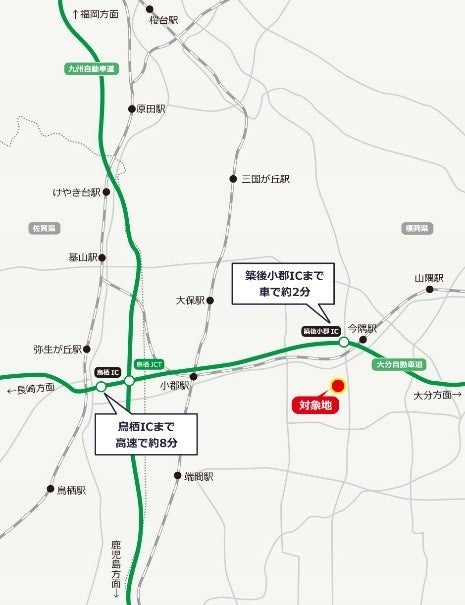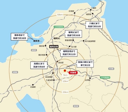 本施設は、九州自動車道「筑後小郡IC」から約1.3km(車で約2分)に位置し、鳥栖JCTや福岡空港、博多港へのアクセスにも優れ、九州全域をカバーできる物流拠点です。最寄り駅から徒歩圏内であることに加え、人口約30万人を擁する久留米市にも隣接しており、通勤利便性が高く、安定した人材確保が見込めます。