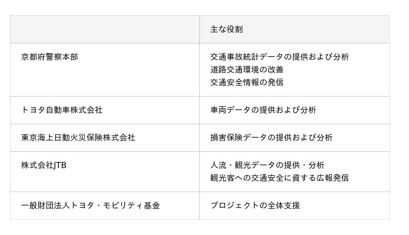 一般財団法人トヨタ・モビリティ基金(理事長:豊田章男、Toyota Mobility Foundation、以下「TMF」)は、本日、京都府警察本部(本部長:吉越清人)とトヨタ自動車株式会社(代表取締役社長:佐藤恒治、以下「トヨタ」)、東京海上日動火災保険株式会社(取締役社長:城田宏明、以下「東京海上日動」)、株式会社JTB(代表取締役 社長執行役員:山北栄二郎、以下「JTB」)と交通事故削減に向けた連携協定を、締結しました。今後は、観光客を始めとする人流データに車のデータを組み合わせて、交錯危険の低減を図るとともに、地域住民と観光客の調和のとれた空間づくりに取り組んでいきます。