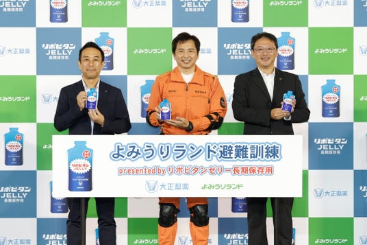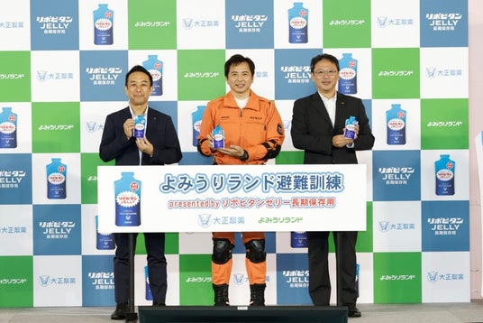 今回の取り組みは、2021年より大正製薬がよみうりランドの「グッジョバ!!」にパートナー企業として参画し、これまで継続的な協力関係が構築されてきたことを背景に、異業種である両社が共同で実施。大正製薬は「災害時に大人からお子さままで、栄養と元気を届けられる防災用備蓄食をつくりたい」という思いのもと「リポビタンゼリー長期保存用」<清涼飲料水(ゼリー飲料)>を開発し、防災備蓄の提案を続けています。また、よみうりランドは、1964年の開園以来60年以上、お客様の安全・安心を第一に考え、避難訓練を重ねてきました。また、2011年の東日本大震災をきっかけに、さらに訓練の精度を高め、安心して楽しめる環境づくりを推進していきます。