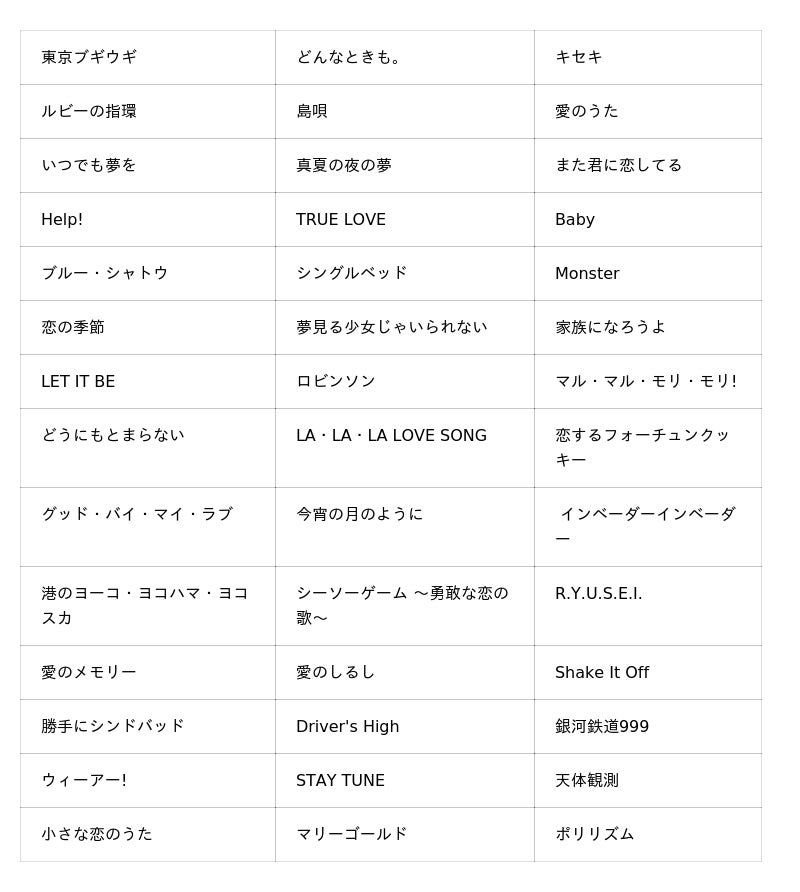 収録曲については、カラオケ「パセラ」様からご提供頂いた再生ランキングデータをベースに、一般に公開されているヒットランキング、Spotifyでの再生数、各世代からのヒアリング結果を元に308曲を選定いたしました。