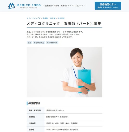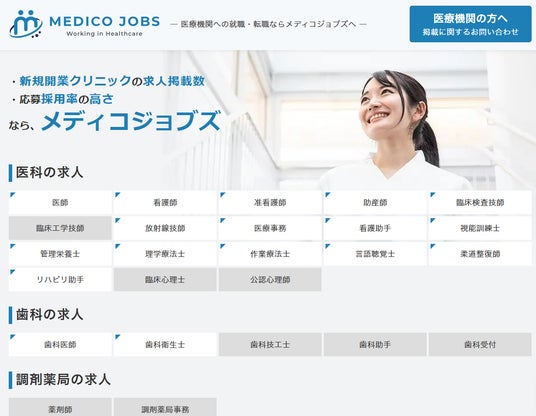 以前にご利用頂いておりました当社サービスの「メディコナビ」から「探しやすさ、内容の見やすさなど使い勝手の向上」「求人情報に関してのGoogleしごと検索などへの情報掲載」「SEOの強化」も兼ね備え、医師や看護師、医療事務、歯科医師、歯科衛生士、薬剤師等の様々な職種の求人を取り扱えるWEB求人支援サービスとなっております。