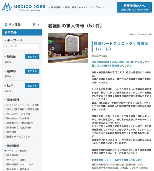株式会社メディココンサルティング(本社:東京都千代田区、代表:田中 明)は医療機関のニーズに応える求人情報サイト「メディコジョブズ」を新たに開発し、2025年1月より正式に運用を開始いたしました。