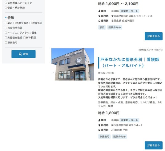 「新規開業」や「駅近」「未経験者歓迎」「教育充実」などの特徴で絞り込むことも可能な為、医療機関様ごとのアピールポイントを十二分に伝えることが可能です。