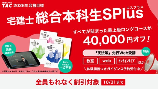 【2026年10月の宅建士に合格】資格の学校TAC宅建士講座が2026年度合格目標コースをリリースしました!10/31までの期間限定でなんと…40,000円割引!