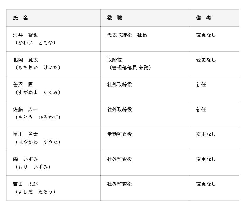社外取締役の西田 拳(にしだ けん)氏におかれましては、本体制変更に合わせて退任のお申し出がございましたため、2025年8月31日付けで社外取締役を退任いたします。