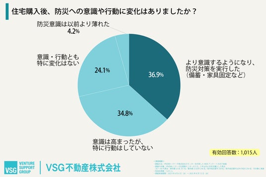「住宅購入後、防災への意識や行動に変化はありましたか?」と質問したところ、「より意識するようになり、防災対策を実行した(備蓄・家具固定など)(36.9%)」「意識は高まったが、特に行動はしていない(34.8%)」「意識・行動とも特に変化はない(24.1%)」「防災意識は以前より薄れた(4.2%)」という回答結果となった。