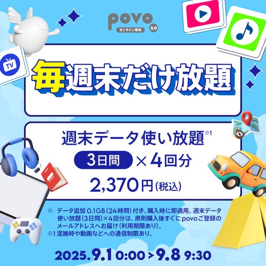 KDDI、沖縄セルラーは2025年9月1日から、povo2.0の期間限定トッピングとして、データ使い放題(注1)のまとめ買いトッピング「povoの通勤・通学定期」2種と、「週末データ使い放題(3日間)」を4回分使うことができる「毎週末だけ放題」を提供します。
