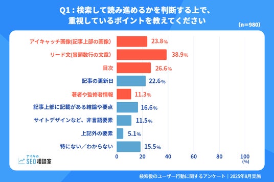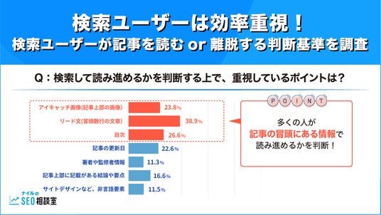 検索結果から流入したユーザーが、その記事を読み進めるかを判断するポイントとして、「リード文」(38.9%)と「目次」(26.6%)が上位となりました。