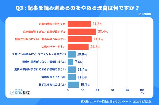 検索結果から記事を訪れたユーザーが「読み進めるのをやめる理由」で最も多かったのは、「文字量が多すぎる/文章が長すぎる」(38.4%)、次いで「結論がわかりにくい/要点が見つからない」(32.3%)、「必要な情報を得たため」(31.2%)が続きました。