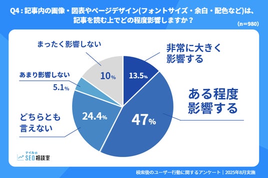 記事を読み進めるにあたって、視覚的な要素が影響するかという設問には、「非常に大きく影響する」(13.5%)、「ある程度影響する」(47.0%)を合わせると、6割以上が「影響する」と回答しました。