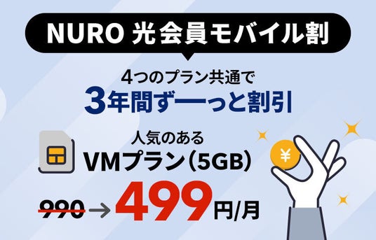 ソニーネットワークコミュニケーションズ株式会社が提供する高速光回線サービス「NURO(ニューロ) 光」は、通信を通したお客さまの体験価値向上を目指す取り組みの一環として、従来の特典を刷新し、「NURO 光会員モバイル割」の提供を本日9月1日より開始します。 本特典により、「NURO 光」と「NUROモバイル」をセットで利用することで、「NUROモバイル」の月額基本料金が3年間499円から利用可能になります。