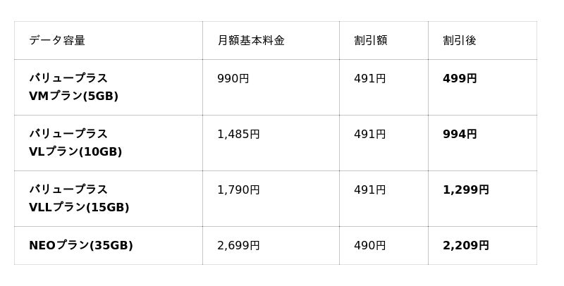 - 対象プラン:VMプラン(5GB)/VLプラン(10GB)/VLLプラン(15GB)/NEOプラン(35GB) ※すべて音声通話付きSIMのみが対象