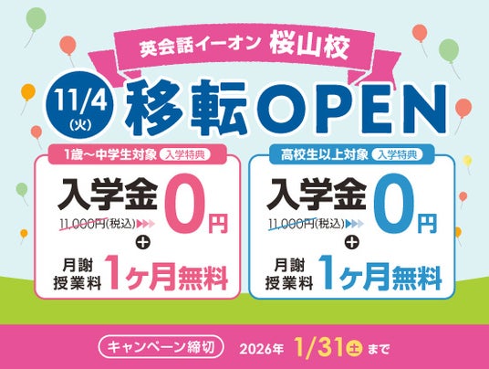 英会話教室を運営する株式会社イーオン(本社:東京都新宿区、代表取締役社長:重野卓、以下「イーオン」)は、2025年11月4日に現在の「イーオン新瑞校」を移転し「イーオン桜山校」としてオープンいたします。