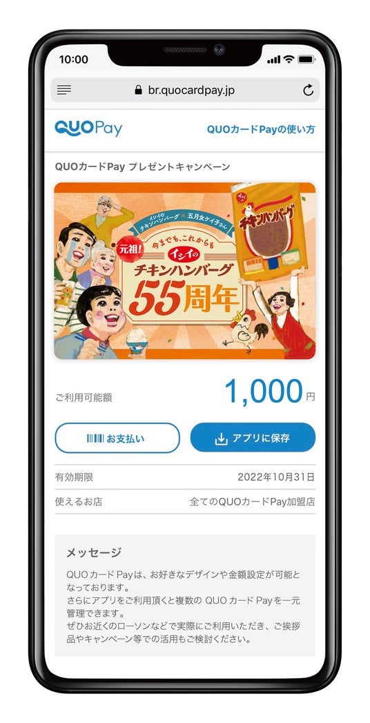 株式会社クオカード(以下当社、本社:東京都中央区、代表取締役社長:近田 剛)が展開するスマートフォンで使えるデジタルギフト「QUOカードPay(クオ・カード ペイ)」は、石井食品株式会社(本社:千葉県船橋市、代表取締役社長執行役員:石井智康)が9月1日(月)より開催する「イシイのチキンハンバーグ55周年キャンペーン」で採用されました。本キャンペーンでは、期間中希望するコースに必要な数の対象商品を購入したレシートでLINEから応募すると、抽選で合計550名様にオリジナルQUOカードPay1,000円分などの賞品が当たります。