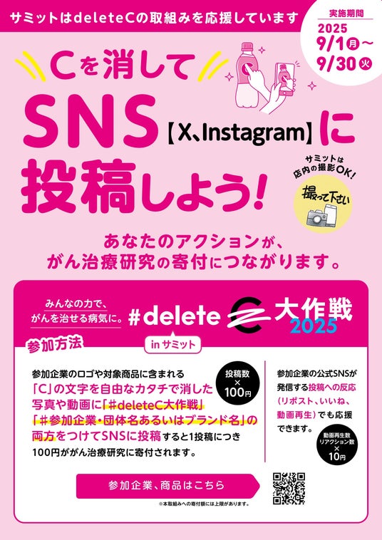 サミットは、deleteCが同期間(9月1日~30日)に実施する、SNS投稿が応援につながる「#deleteC大作戦」にも、啓発パートナーとしてサミット公式や各店舗のSNSアカウントで参加します。また、お客様にも広くご協力をお願いし、一緒に投稿を盛り上げます。