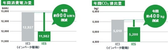 IE5モータを使用した対象製品(プレストNEOギヤモータ、ハイポニック減速機 中空軸RNYMタイプ、サイクロ減速機、ベベル・バディボックス減速機4シリーズ)を使用することで、消費電力やCO2排出力を大幅に抑えることが可能になります。