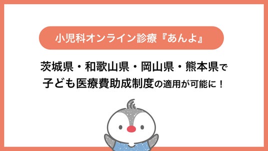 小児科にかかりたい親子と在宅で働く医師をつなぐオンライン診療サービス「あんよ」を運営するジークス株式会社(愛知県名古屋市、代表取締役社長CEO:村上嘉一、以下当社)は、2025年9月から茨城県・和歌山県・岡山県・熊本県の子ども医療費助成制度の適用が可能になりましたのでご案内いたします。(※)