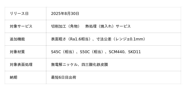 機械部品調達のAIプラットフォーム「meviy(メビー)」(サービス提供元:株式会社ミスミグループ本社)は、2025年8月30日より、切削加工(角物)(以下、切削角物)において、熱処理(焼入れ)サービスを大幅に強化しました。今回のアップデートでは、機械設計者のニーズに応え、これまで対応していなかった表面粗さ(Ra1.6まで)と寸法公差(±0.1mmまで)の指定が可能となりました。さらに、納期を大幅に短縮し、最短6日目出荷を実現しました。これにより、高い耐摩耗性や硬度、そして精密な寸法が求められる部品の調達が、よりスムーズに行えるようになります。
