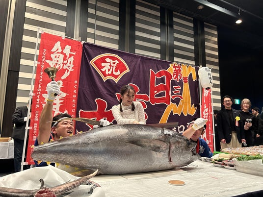 交流会開始と同時に、65kgの天然本マグロの解体ショーも実施。一刀目は岡田結実さんに担当していただきました。会場からは、「マグロの解体ショーは、なかなか間近で見る機会がなく、初めての体験だったため、交流会の目的を忘れてしまうほど貴重な体験だった」とのお声をいただきました。