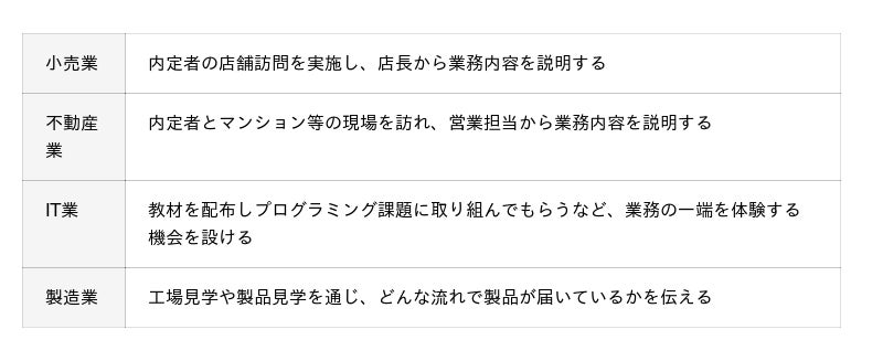上記4つのポイントを実現するため、「職場訪問」「業務体験」「現場社員も参加する座談会」などを通じて、業務内容を理解したり、不安やわからないことを聞いたりできる場を設けるとよいでしょう。
