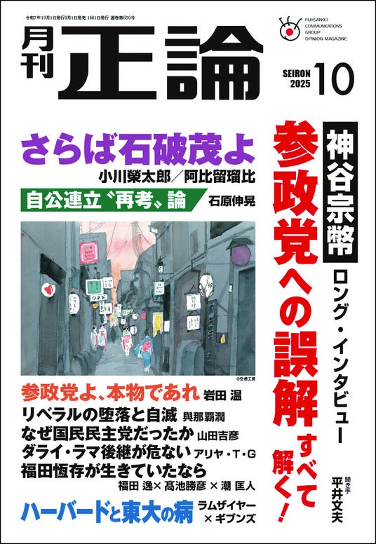 日本の針路を問う論壇誌、月刊「正論」10月号(産経新聞社発行)を9月1日に発売します。参政党の神谷宗幣代表へのロング・インタビューでは、参院選での「台風の目」としての躍進を牽引した背景を、メディア報道やSNS上の反響も含めて浮き彫りにしています。さらに、石破茂首相に対する直言をテーマにした論考を特集。「さらば石破茂よ! 日本国民、覚醒のとき」「自公連立“再考”論」「石破茂の『本質』を射る! 安倍晋三の慧眼」という本誌限定の寄稿文を収載。鋭い視点で首相の在り方に迫ります。時代の転換期における政治の現在を読み解く一冊となりました。