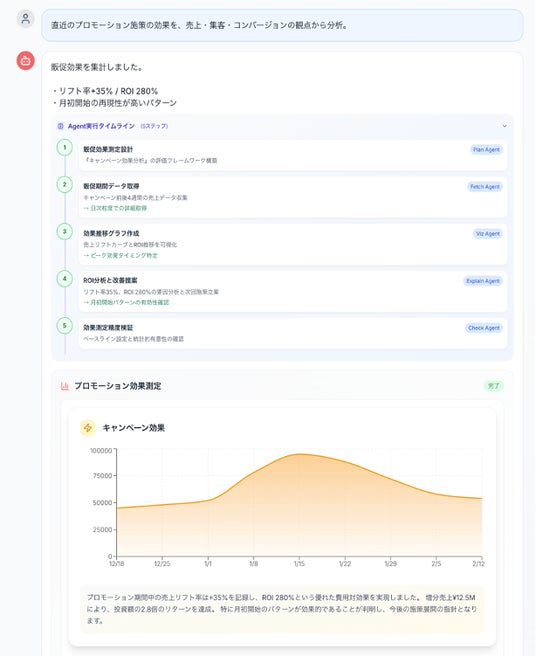 「“過去3ヶ月以内に購入履歴があり、直近1ヶ月以内にメルマガを開封したユーザー”を抽出して、キャンペーンAとBでのコンバージョン率を比較して」などの自然言語指示により、セグメント定義からSQL生成、結果の可視化、インサイトの要約までを自動実行。