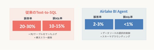 AIがデータベースの構造を正しく理解する「スキーマグランディング」や、RAG(Retrieval-Augmented Generation)技術を駆使することでハルシネーションのリスクを1%未満に抑制し、極めて高品質なデータ抽出を可能にしました。