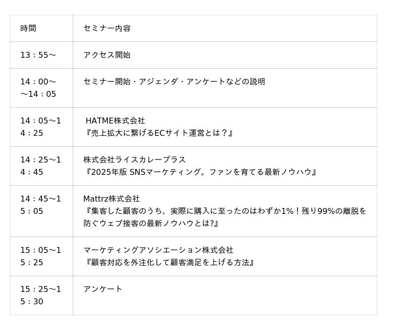 マーケティングアソシエーション株式会社の子会社であるHATME株式会社(本社:東京都台東区 代表取締役:中園広和、以下当社)は2025年9月17日(水)に、株式会社ライスカレープラスとMattrz株式会社とマーケティングアソシエーション株式会社で4社共催ウェブセミナー「ファンが育つ!! SNS×サイト運営×顧客対応で実現する売上アップ術」を、開催いたします。