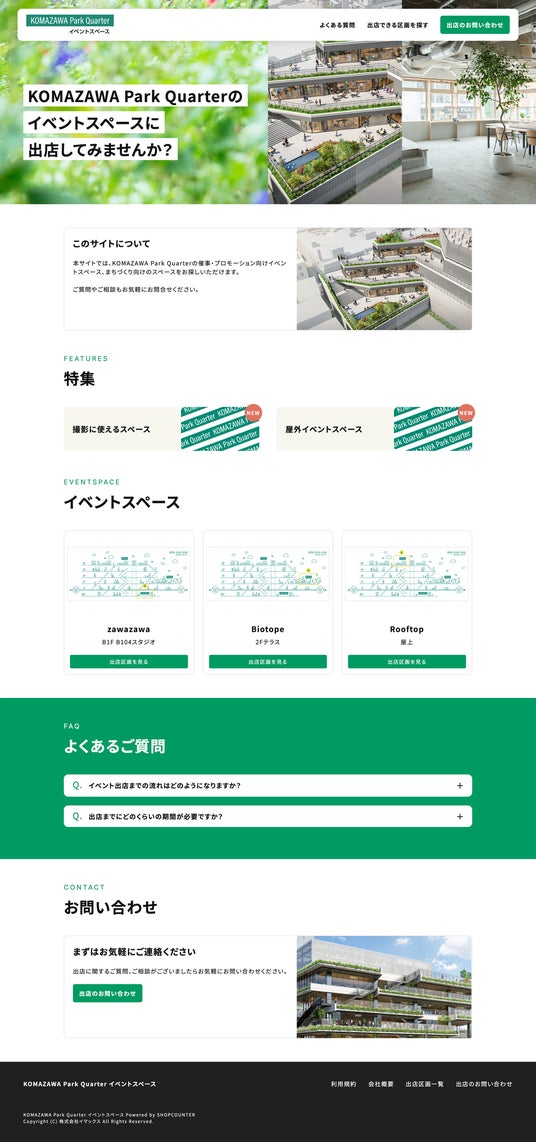 今回の導入により、イマックスは新たなテナント募集サイトを立ち上げます。イベント専用区画としては、屋上ビオトープや地下ギャラリーなど3つのスペースを掲載し、多様な利用ニーズに対応。常設区画は現時点で全て契約済みですが、将来のテナント構成の変化や新規出店の機会に備え、今後出店を希望されるテナントとのつながりづくりに活かします。こうした募集・管理業務をショップカウンター エンタープライズで一元化し、歩率契約における売上データを正確かつ即時に把握できる体制を整えます。