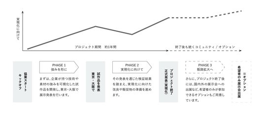 プロジェクトは、企業とデザイナーの出会いから始まり、展示を経て、約1年をかけて協業することで、アイデアやデザインを育てていきます。