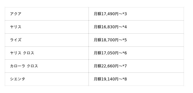 自動車保険や自動車税など、クルマにかかる諸経費がコミコミ月々定額のクルマのサブスクリプションサービスです。人気のトヨタ車・レクサス車・SUBARU車をラインアップ、 高品質な中古車も取扱っています。WEBでも簡単にお申込みから契約まででき、気軽にカーライフを始めることができます。