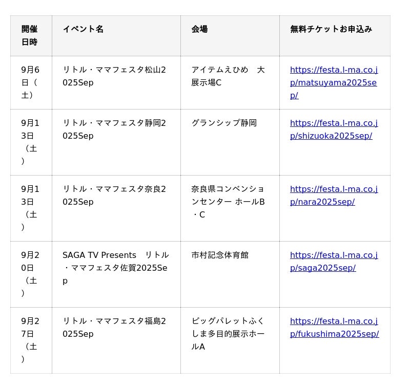 国内最大規模の親子フェスタを開催する株式会社エンファム.は、9月6日(土)松山、9月13日(土)静岡・奈良、9月20日(土)佐賀、9月27日(土)福島にて、親子イベント【リトル・ママフェスタ】を開催いたします。会場では、親子で一緒に楽しめるステージや、毎回大人気のキッズレース、おひるね・おすわりアート撮影会(事前予約制)など、笑顔あふれる体験型プログラムをご用意。ママ・パパとお子さんの“思い出づくりの場”として、ご家族皆様でお楽しみください。
