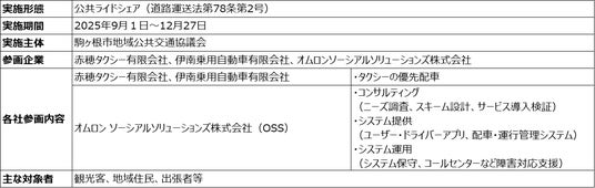オムロン ソーシアルソリューションズ株式会社(本社: 東京都港区、代表取締役社長:四方 克弘、以下OSS)は、2025年9月1日から長野県・駒ヶ根市で、公共ライドシェアサービスの導入に向けた実証実験を行います。本取り組みは、昨年度実施の実証実験の第二弾となり、駒ヶ根市でのライドシェアサービスの本格導入に向け、観光シーズンでの交通空白解消および移動活性化に向けた取り組みとなります。