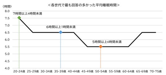 30代後半~40代になると「眠りが浅い」・「睡眠の質が悪い」ことに悩み始める人が増えており、平均睡眠時間も6時間以上7時間未満と回答した人が最も多いことから、“十分な睡眠がとれなくなり始めている”ことが分かります。