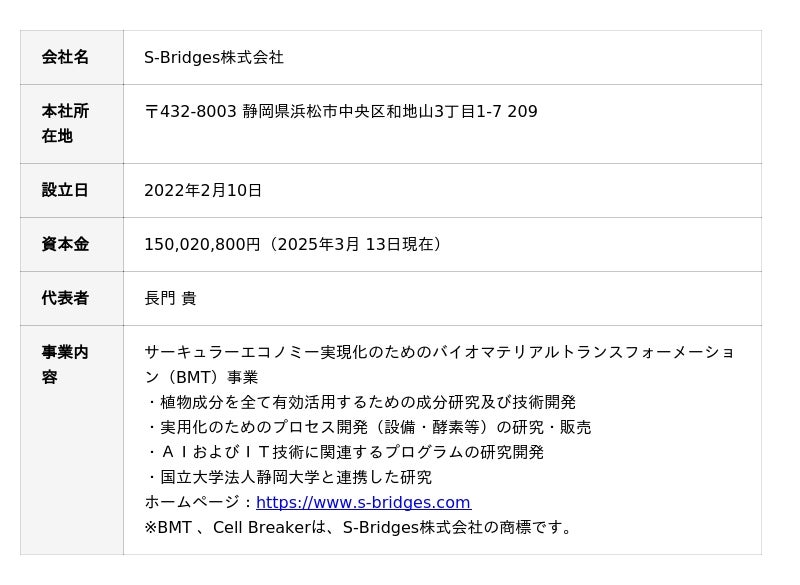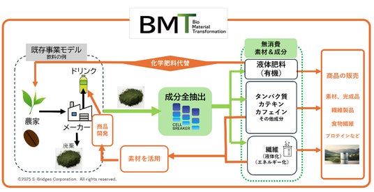S-Bridgesは、静岡大学発のベンチャー企業で、廃棄物を未利用資源として100%有価物化することをめざしており、食品加工工場で排出される茶殻やコーヒー殻などの食品加工残渣を含む無消費素材からタンパク質、液肥原料などの有用成分を抽出する「Cell Breaker(R)」システム(以下「CBシステム」)を有しています。