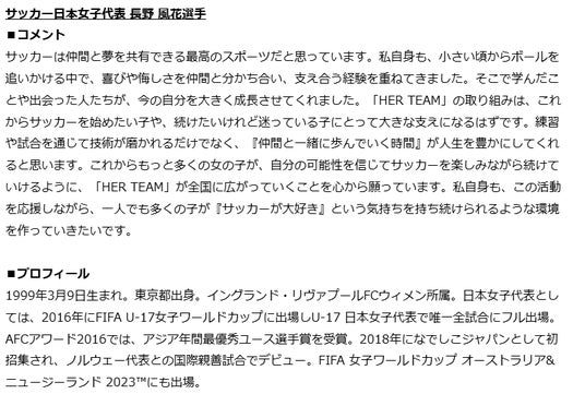 「HER TEAM」に参加したことで、日々の練習の積み重ねで得られた勝利の喜びや、つまずいた時に触れられた仲間の優しさをたくさん経験することができました。小学校のチームを卒団した当時、地元に女子サッカーのジュニアユースが新しくできました。サッカーを続けるかかなり迷いましたが、そこでサッカーを続けられたからこそ、高校で女子サッカーを楽しめている今の自分がいます。これからもサッカーができるという環境を大切にし、目標を高く持って楽しんでいきたいです。