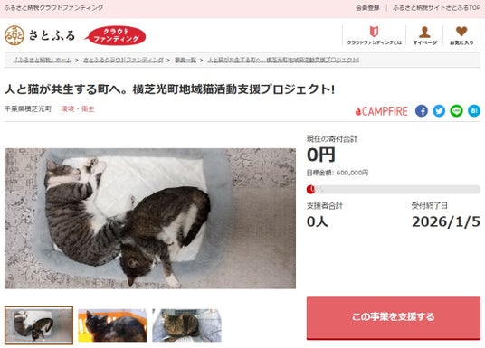 千葉県横芝光町とふるさと納税ポータルサイト「さとふる」を運営する株式会社さとふる(本社:東京都中央区、代表取締役社長 兼 CEO:藤井 宏明)は、「さとふるクラウドファンディング」にて、「人と猫が共生する町へ。横芝光町地域猫活動支援プロジェクト!」の寄付受け付けを2025年9月1日より開始します。