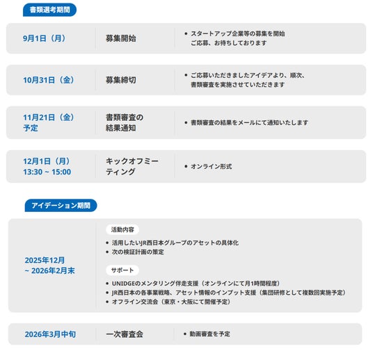 株式会社アルファドライブの子会社である株式会社ユニッジ(以下、UNIDGE)は、西日本旅客鉄道株式会社(以下「JR西日本グループ」)が実施する「JR西日本グループの事業共創プログラム『ベルナル』」の運営サポートを行っており、共創を志向するスタートアップ企業等を2025年9月1日より募集します。