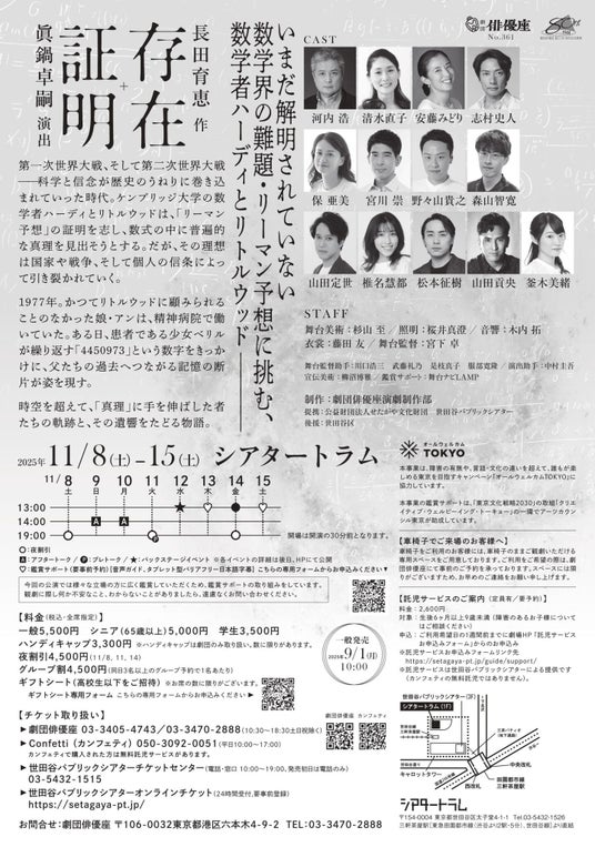 劇団俳優座主催、本公演 No.361『存在証明』が2025年11月8日 (土) ~ 2025年11月15日 (土)にシアタートラム(東京都 世田谷区 太子堂 4丁目1番地1号)にて上演されます。 チケットはカンフェティ(運営:ロングランプランニング株式会社、東京都新宿区、代表取締役:榑松 大剛)にて発売中です。