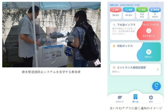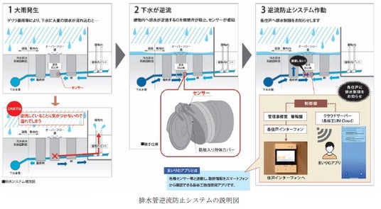 本イベントで展示した「排水管逆流防止システム」は、局地的に激しい雨が降る「ゲリラ豪雨」などにより、下水道に大量の排水が流れ込んだ場合に、建物内への排水の逆流を開閉弁によって防止するシステムです。システム作動時には、住戸のインターフォンへ通知がされるほか、当社が独自で開発した「まいりむアプリ」※1を通じて居住者にシステム作動を通知します。