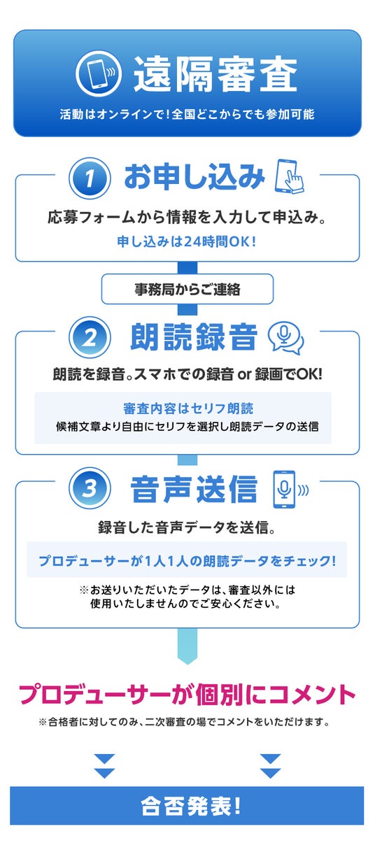 「声優になりたい」という想いをカタチにするプロジェクト。実力派プロデューサーやコーディネーターによるサポートを受けながら、声優活動に必要なツールと環境を手に入れることができます。 声の活動経験は問いません。参加者の多くが未経験からスタートしています。
